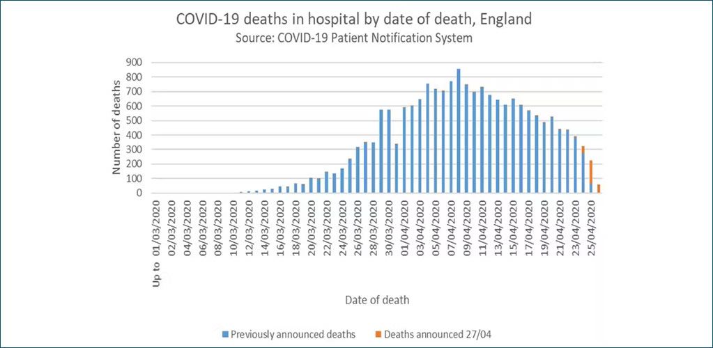 Number deaths reported in hopsitals in England aggregated by date of death shows that we are clearly over the peak. | NHS England