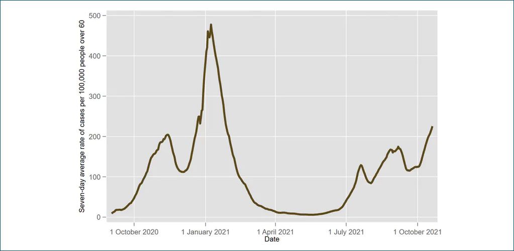 COVID cases in England in people aged over 60, October 2020-October 2021.