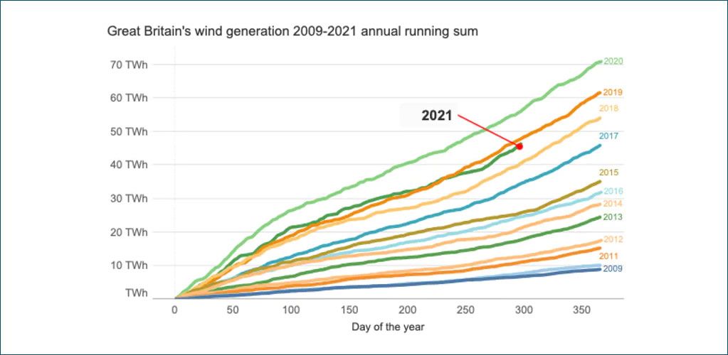 However, there is still a residual amount of coal generation that has supplied between 1% and 2% of electricity demand at an annual level from 2019 to 2021. Coal is on track to generate around six terawatt-hours (TWh) of electricity in 2021. The drop in wind generation from 2020 to 2021 alone (largely due to an unusually calm summer) has been around 6-8 TWh.