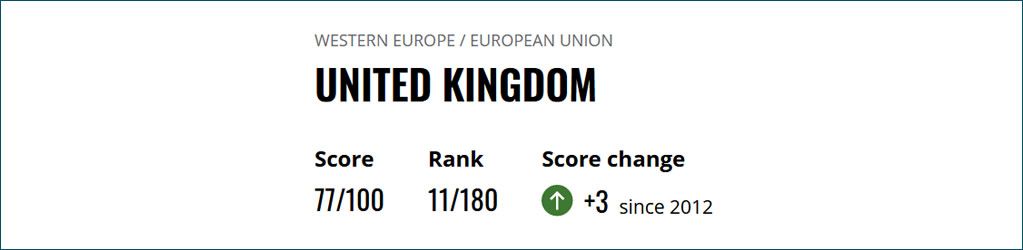 The UK came out 11th with a score of 77 out of 100. The Danes and New Zealanders were 11 points ahead of that, scoring 88 each. That’s pretty much par for the course. The UK was on 77 in 2019, albeit one place lower in the index in 12th. Indeed, it’s an improvement on where the UK was a decade or so ago. In 2012, for example, the UK was 17th with a score of 74.