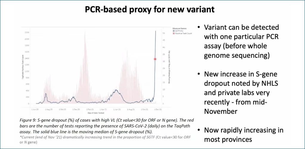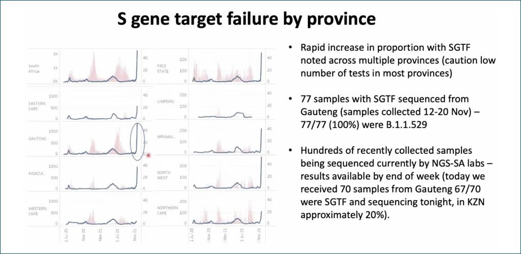 1. A rapid increase in frequency of this variant in Gauteng and other South African provinces against a Delta background. While the sequencing data will be skewed (figure 1), data from PCR testing shows rapid growth (figure 2).