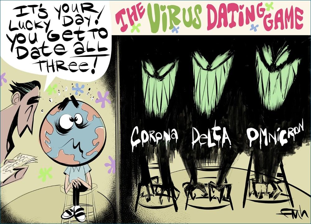 Just when we think we’re out of one bad relationship (Coronavirus), we find ourselves in another one (Omicron). — Today’s Political Cartoon by FM Hansen.