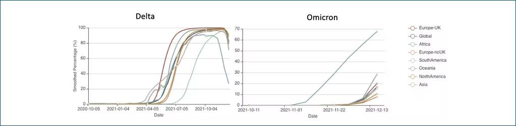 Relative variant genome frequency per region. It shows an increase in delta share over 2-3 months between March and July 2021 and its rapid replacement by omicron in November 2021. Note different time scales in the plots. | The GISAID Initiative