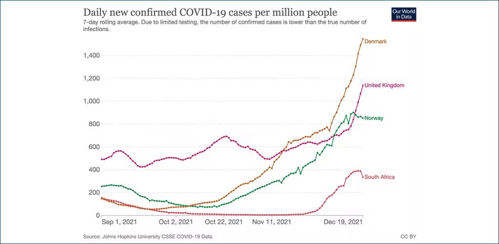 Reported number of cases in the UK compared with South Africa, Denmark and Norway, as of December 20 2021. | Our World in Data