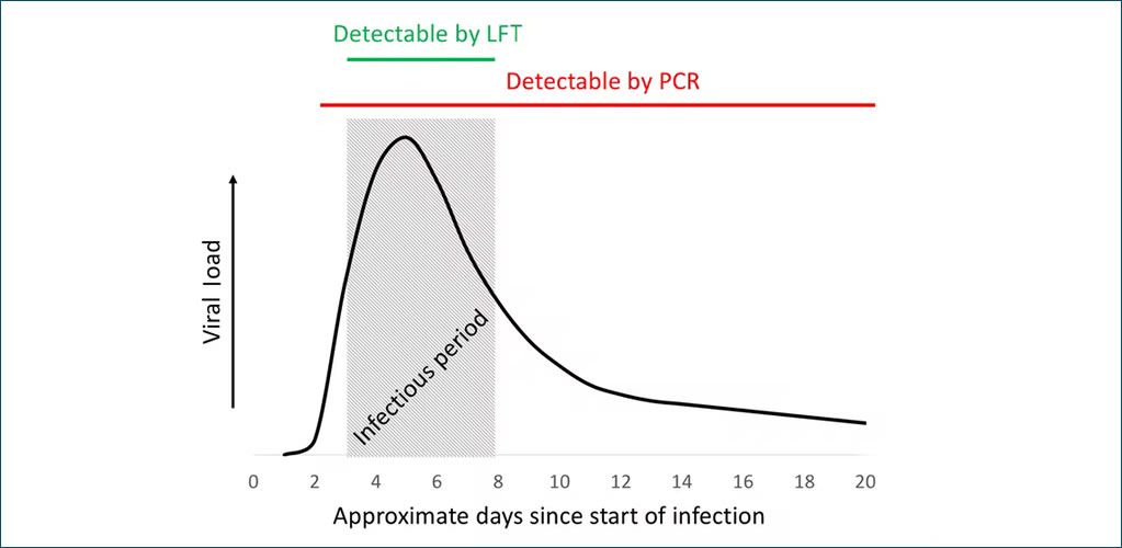 Graph showing approximately when LFTs and PCR tests will give positive results in relation to the most infectious period. | Dr Simon Kolstoe