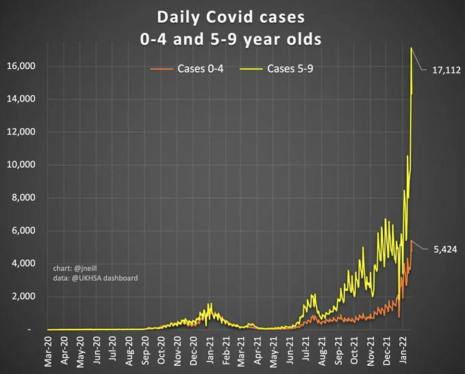 Daily COVID cases, 0-4 and 5-9 year olds. | Chart: @jneill - Data: UKHSA
