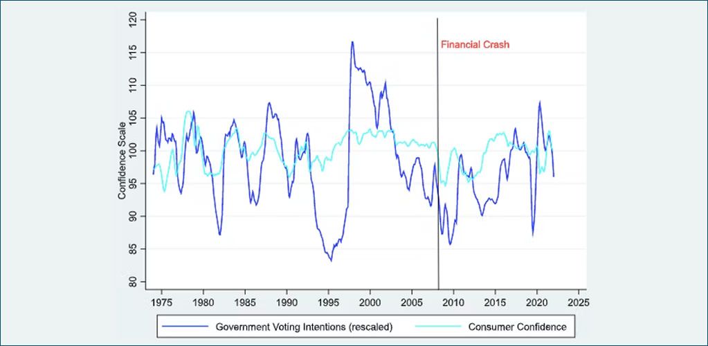 Statistical modelling shows a clear pattern that rising consumer confidence produces an increase in government support. And falling confidence produces a decline in support.