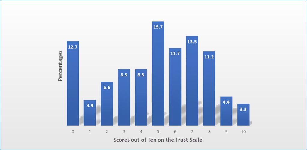 We asked respondents to indicate the extent to which they trust institutions using a scale of zero to ten, where zero meant that they had no trust at all, and ten meant that they trusted it completely. The average trust score on this scale for the UK government was 4.8, with some 56% of respondents scoring between zero and five, and nearly 13% stating that they did not trust the government at all. On the other side of the scale, just over 3% said that they trusted it completely with a score of ten. The most common choice was a trust score of five.