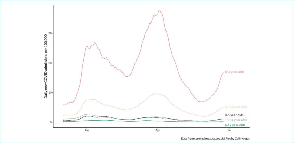 The latest hospital data shows that the number of new COVID patients (a combination of new admissions and people who catch COVID in hospital) in England is rising. In the most vulnerable age groups (65 and over) these figures are at almost two-thirds of the January peak seen during the initial omicron wave.