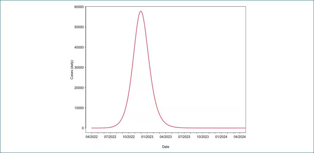 A plot illustrating the daily number of cases under Scenario 2. | Adam Kleczkowski
