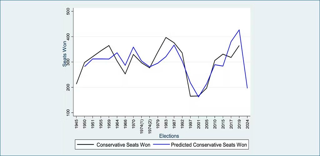 Conservative seats won and predictions of seat wins, 1945 to 2024