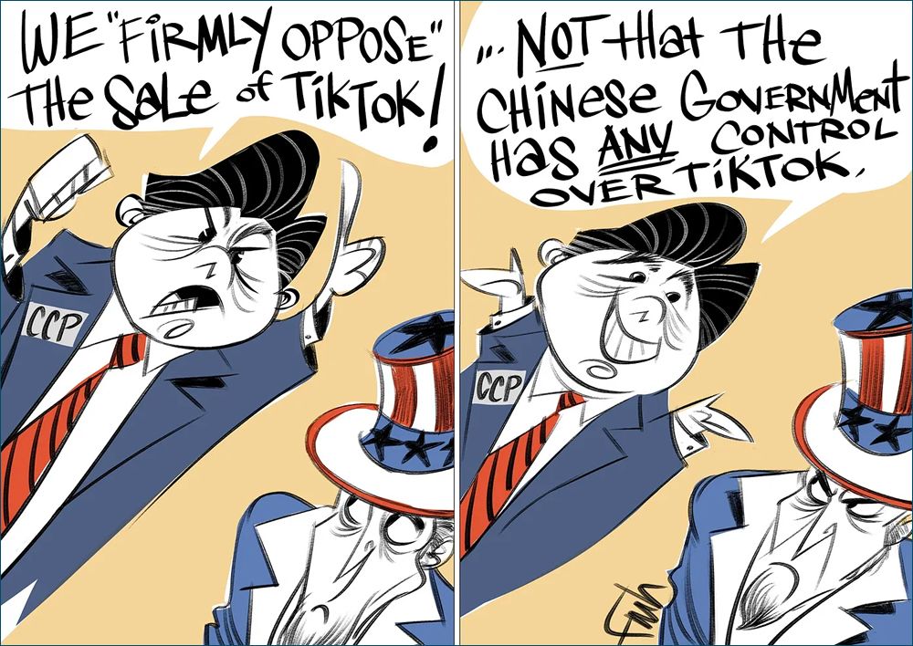 Hours before Thursday’s House Panel on TikTok, the Chinese Government official said they opposed the sale - openly contradicting TikTok CEO’s argument that the CCP has no control over TikTok. – Today’s political cartoon by FM Hansen.