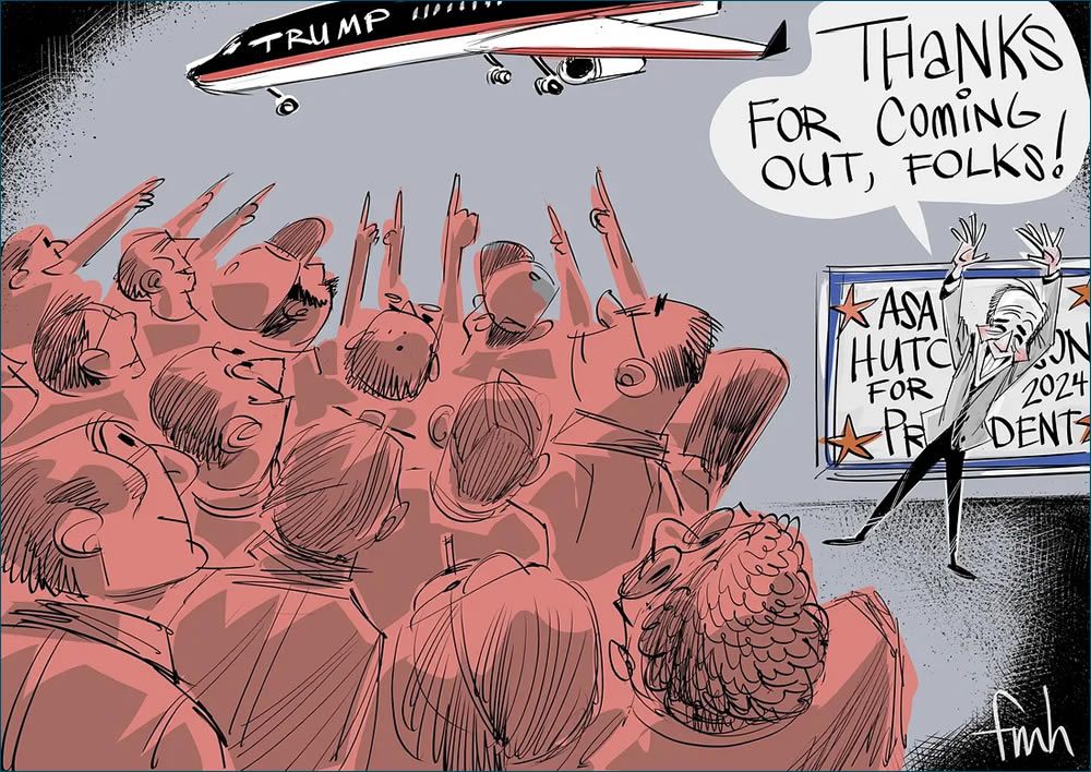 Former Arkansas Republican Governor Asa Hutchinson enters the 2024 Presidential race against Donald Trump. Perhaps not the best time to announce you’re running for President. – Today’s political cartoon by FM Hansen.