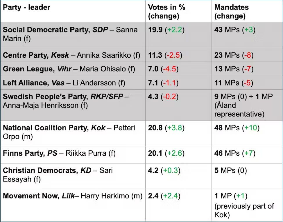 Among these parties, only the social-liberal Swedish People’s Party of Finland (RKP/SFP) maintained its position. The Left Alliance (Vas) and the Green League (Vihr) both lost ground. There are indications that among the supporters of these parties some chose to vote tactically for SDP in an unsuccessful attempt to preserve Marin’s hold on the premiership.