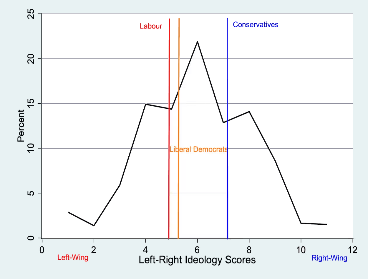 The three vertical lines show the average ideological locations of Conservative, Labour and Liberal Democrat voters in that election. On average the Conservative voters scored 7.6, Labour voters 4.7 and Liberal Democrats 5.2 on the scale.