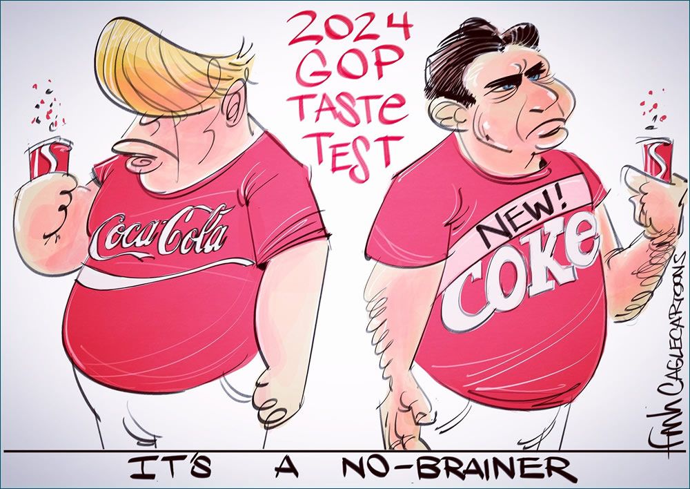 Trump or DeSantis? The former president or the Governor of Florida? The original or the copy? – Today’s political cartoon by FM Hansen.