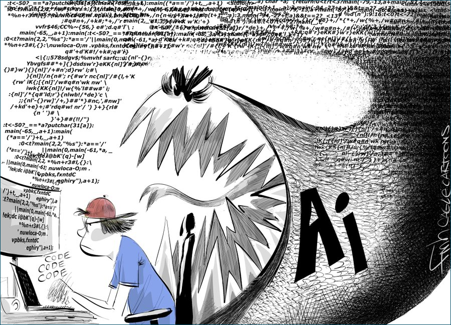 Computer programmers and coders could see their jobs reduced to almost nothing in 5 years, thanks to AI. They are literally training their replacement. | Political Cartoon by FM Hansen.