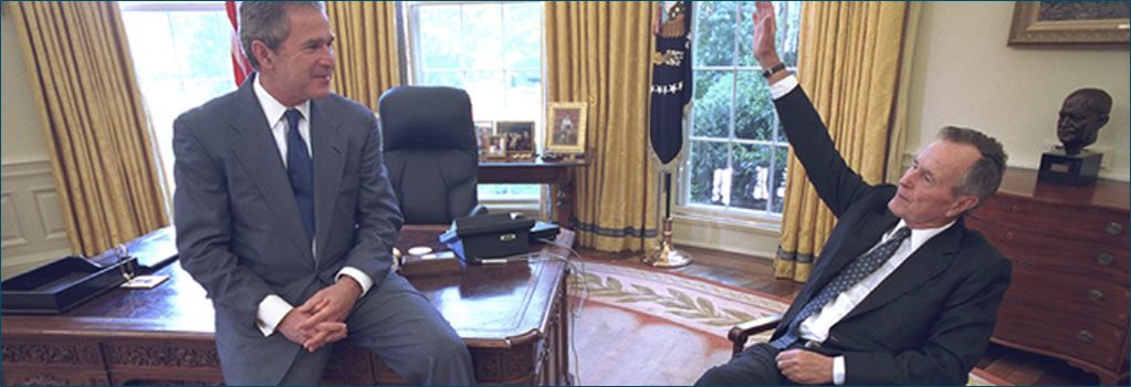 President George W. Bush (left) and Former President George H. W Bush (right) in the Oval Office.