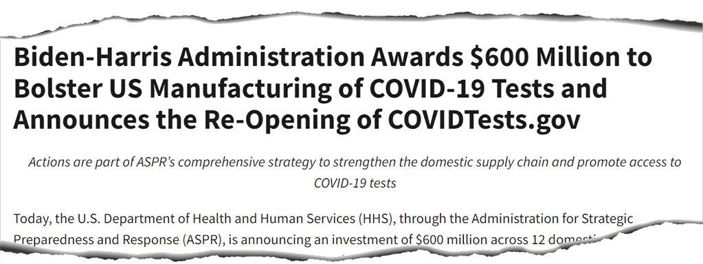 Biden-Harris Administration awards $600 million to bolster US manufacturing of COVID-19 tests