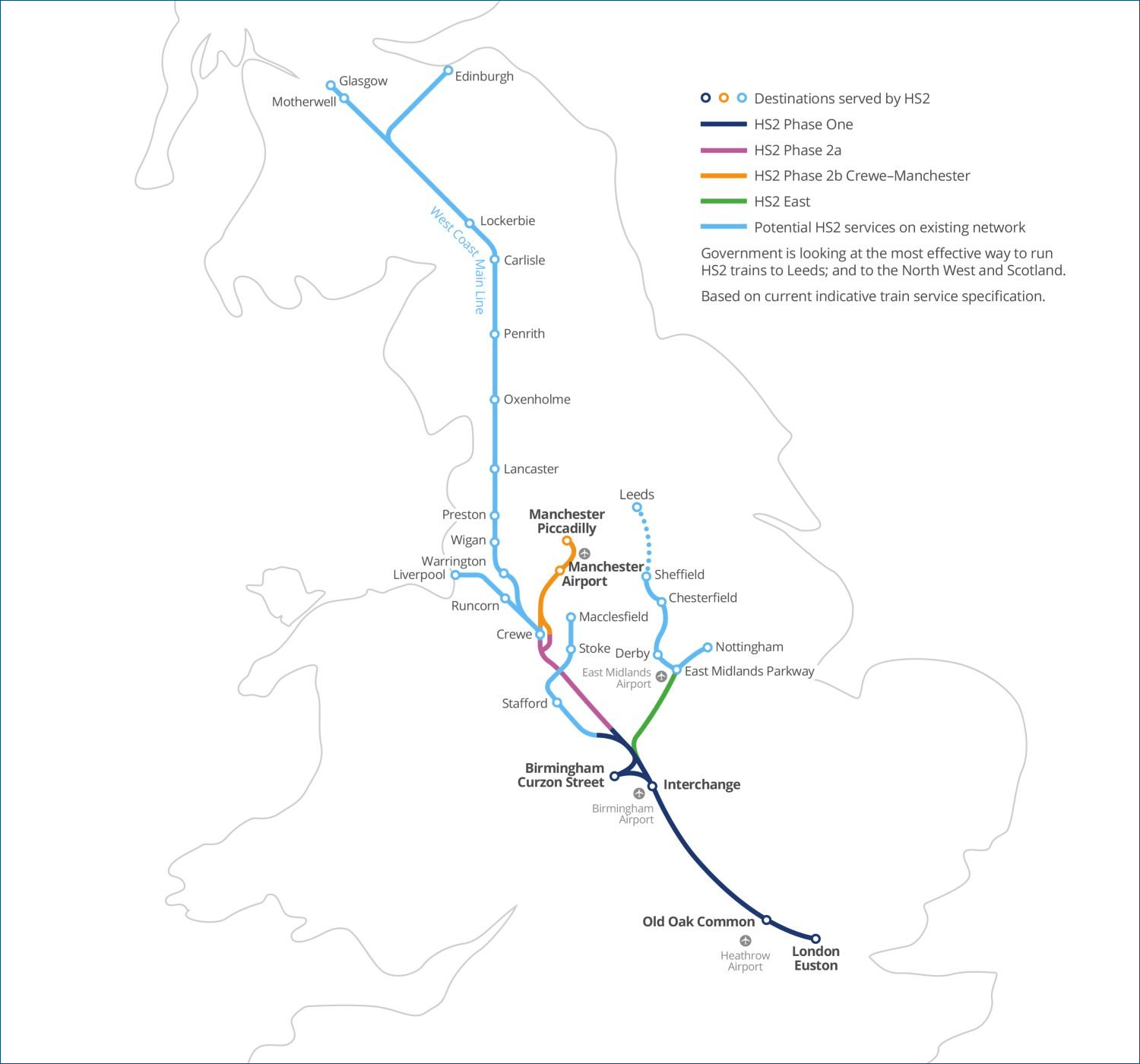 This map shows the full HS2 network and how it will integrate with, and deliver services to, the existing rail network.
