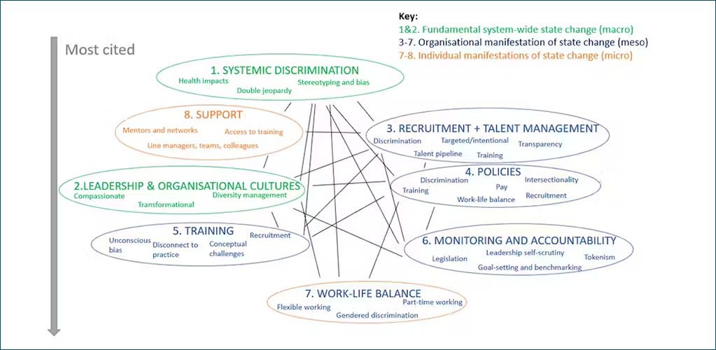 I identified eight barriers or drivers (often two sides of the same coin) to career progression for this group. These are: systemic discrimination; leadership and organisational cultures; recruitment and talent management; policies; training; monitoring and accountability; work-life balance; and support.