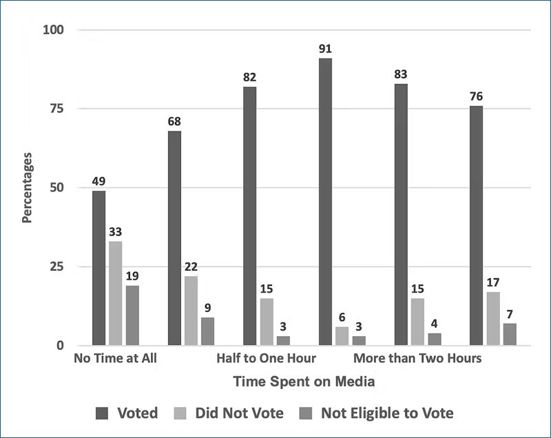 There is a strong relationship between voting turnout and media usage. Only 49% of people who spent no time at all on news gathering turned out to vote, while 33% of them did not vote. In fairness, 19% of this group were not eligible to vote, since the survey picked up people who are not on the electoral register. Even so, if we look at the group who spent one to two hours looking for news about politics, 91% of them voted, and only 6% failed to do so. It is clear that media usage and participating in elections are closely related.