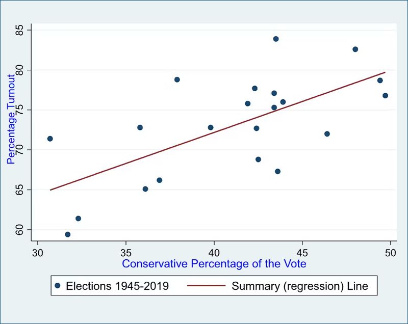 Media malaise damages political participation in general, and given the massive changes highlighted in the Reuter’s report, it could indicate that a lower turnout should be expected in the next general election. If we examine all 21 general elections in Britain since 1945, there is a strong correlation between turnout and the Conservative vote. The more people vote, the better the Conservative Party does in the election.
