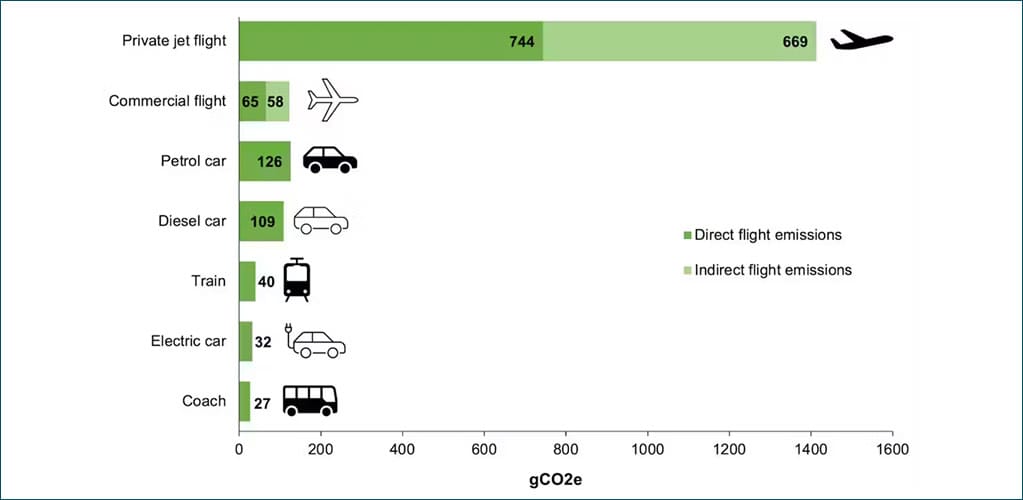 For a journey from London to Dubai, private jet travel is 11 times more polluting than a commercial aircraft, 35 times more than train and 52 times more than coach travel (even after factoring in a flight from Istanbul, since you can’t go all the way to Dubai by train or coach). For those flying from the UK, the longer flight to Dubai compared to Egypt means emissions will be higher this year.