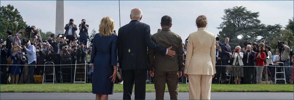 — Joe Biden and Jill Biden greeting Ukrainian President Volodymyr Zelenskyy and First Lady Olena Zelenska, 21 September 2023.
