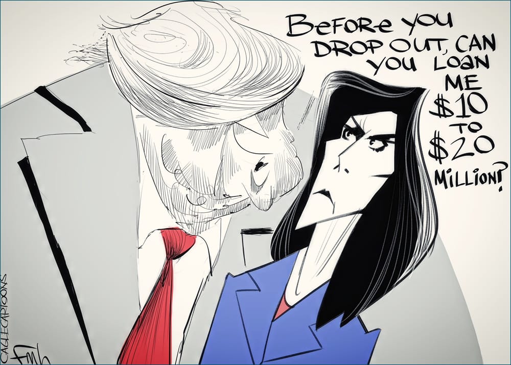 Lately Nikki Haley has one thing that Donald Trump doesn’t, money... | Today’s Political Cartoon by FM Hansen.