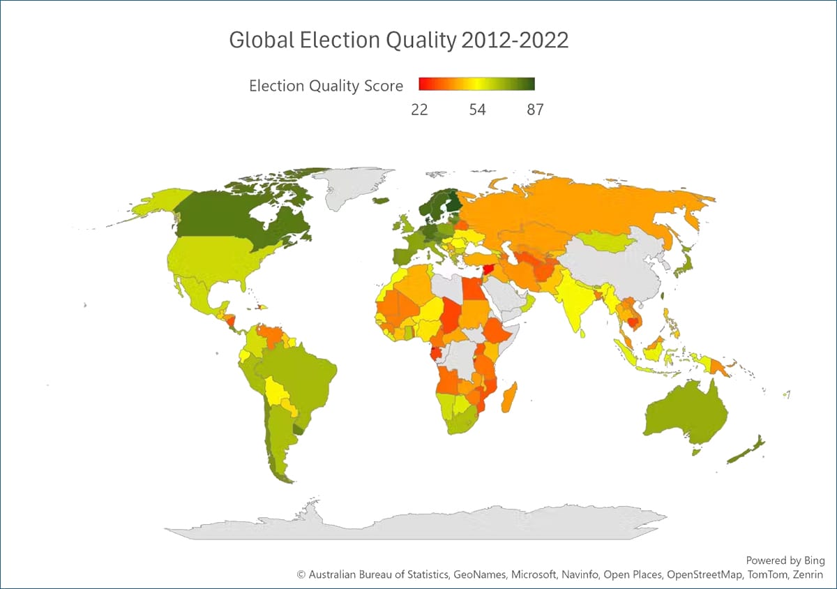 There is considerable work to be done to improve elections globally. Since 2012, the Electoral Integrity Project, an international academic think tank which researches how to improve elections, has published data on election quality. The map below shows the average election quality between 2012-2022, using this data. Countries in green have the highest quality, while those in red have a lot of work to do to improve election quality.