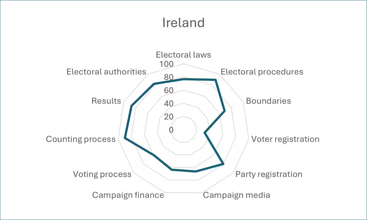 Moreover, Ireland has been addressing weaknesses in its electoral processes. As the graphic above shows, Ireland’s greatest weakness in elections is its voter registration process – and the Electoral Reform Act of 2022 has set in train a process for modernising this.
