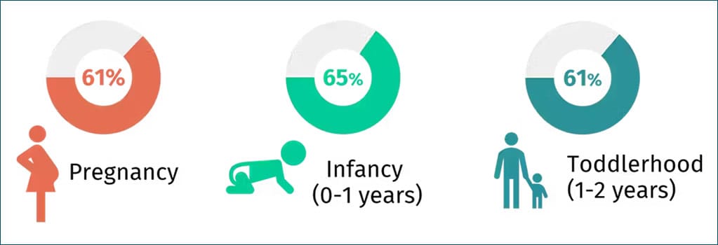 — Figure 1: Percentage of mothers receiving the target number of visits at each stage of the Family Nurse Partnership.