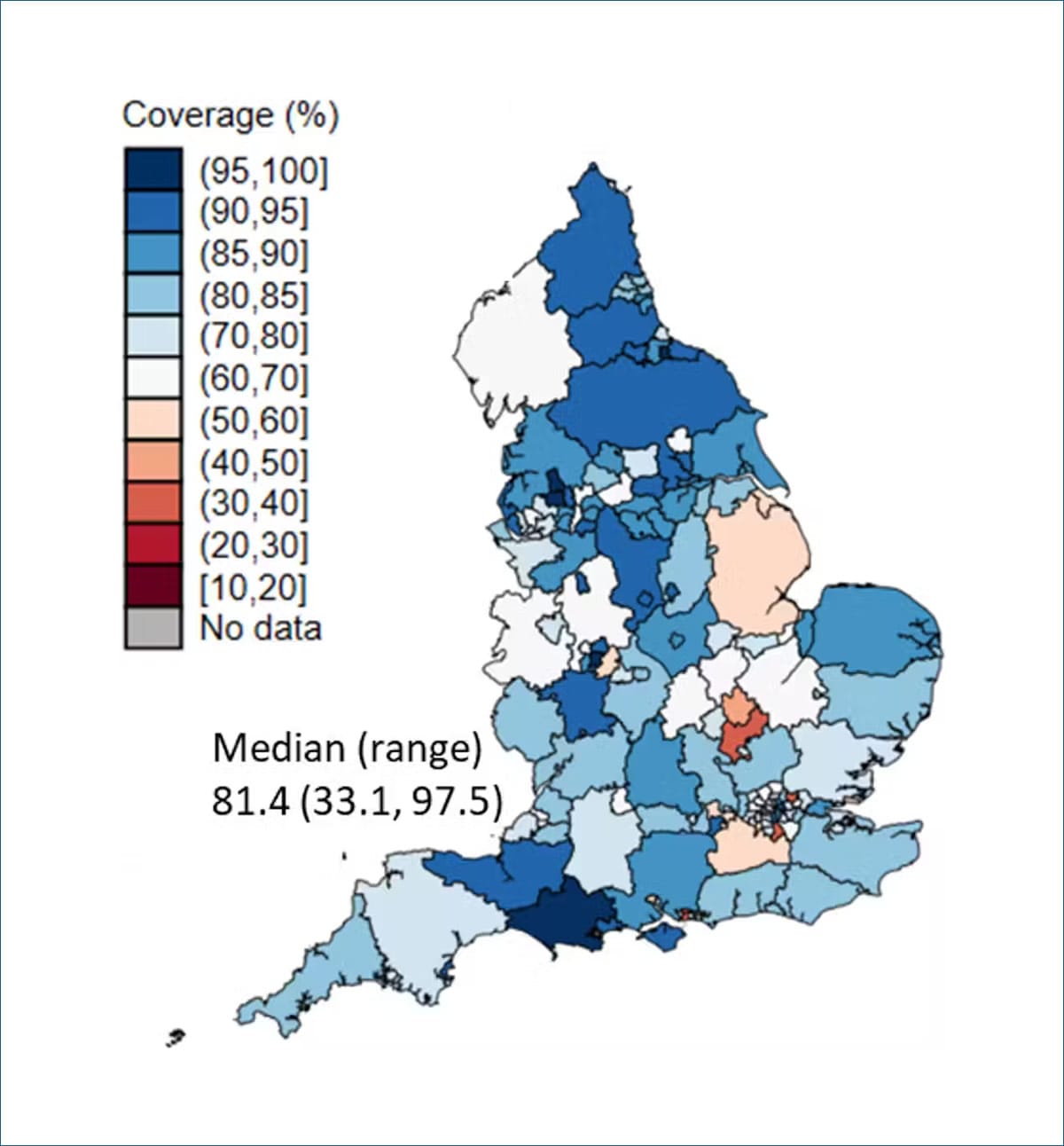 The real-term value of the public health grant from which health visiting is commissioned has fallen by 27%. In the context of this disinvestment, there is huge variation in how local areas are delivering their services. For example, our research has shown that the number of children receiving their (mandated) 2 to 2½-year review ranges between 33%-97% depending on in which area they live (Figure 2).