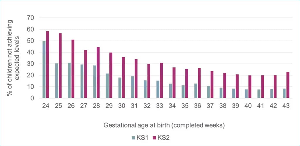 — Figure 3: The power of linking cross-sectoral data to understand the impact of early life factors on health and development: the relationship between gestational age at birth and school attainment at age seven (KS1) and 11 (KS2).