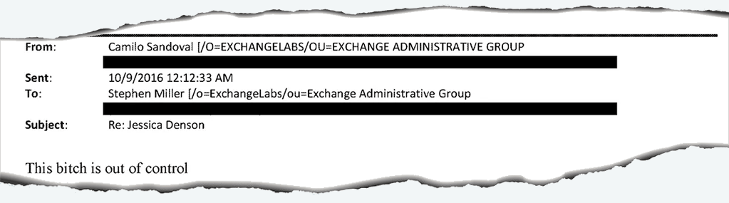 Based on Bannon’s encouraging emails about her performance, Denson thought she would be hired for Trump’s transition. But documents showed the campaign’s human resources director telling others, “Jessica is NOT ever to be hired onto transition, inaugural or brought to DC!” An email from Sandoval to senior official Stephen Miller said, “This bitch is out of control.”