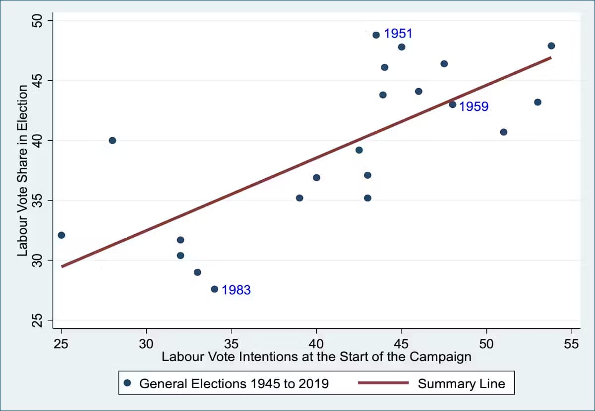 To get an idea of how important campaigns are in general elections, we need to look at them over a long period. The chart below shows the relationship between Labour voting intentions at the start of each general election campaign, and the share of the vote for the party in the subsequent election. It covers all 21 contests since the end of the second world war.