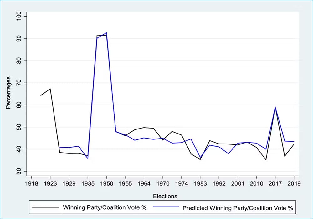 The chart below shows the actual performance of the incumbent government and the predicted performance from the model. In the event, the model is a pretty good predictor of what happened.