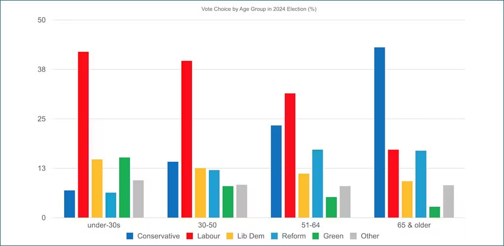 — Bar chart showing vote choice by age group (5-7 July 2024).