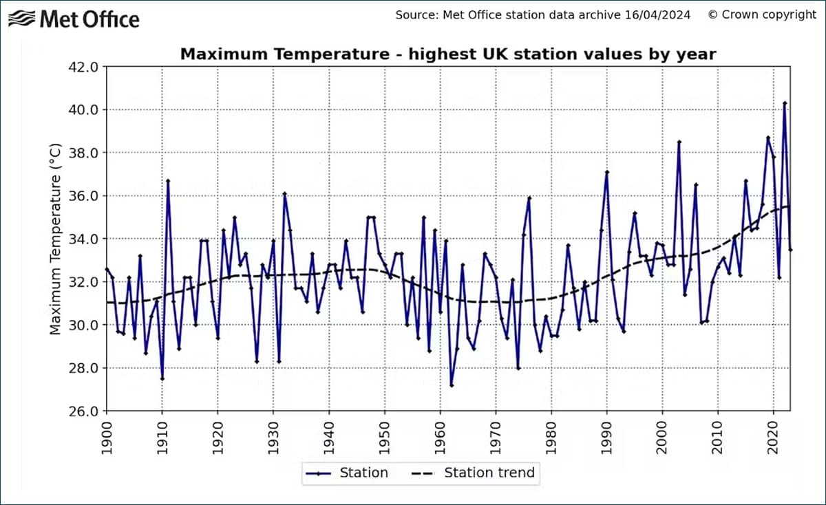 — The highest observed temperature each year in the UK, from 1900 to 2023 —