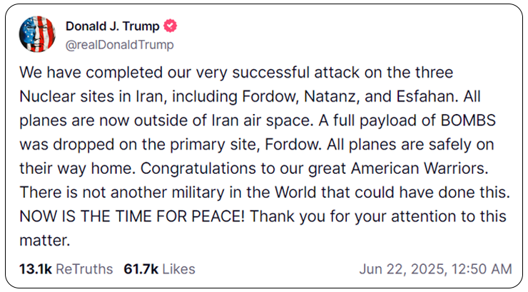 W hen US B-2 bombers hit Iran’s nuclear facilities at Fordow, Natanz and Isfahan, Donald Trump declared the strikes a success and urged the Islamic Republic to make peace or face even more devastating strikes. The US president proclaimed the might of the US military, operating in full coordination with Israel, before taking to Truth Social.