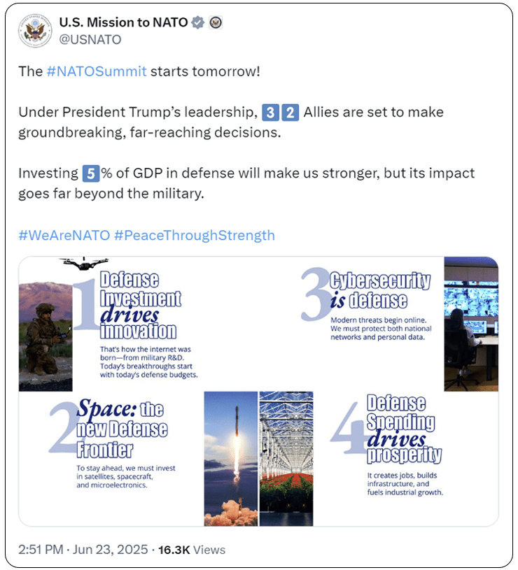 🔹 NATO members agree to raise defence spending to 5% of GDP by 2035.