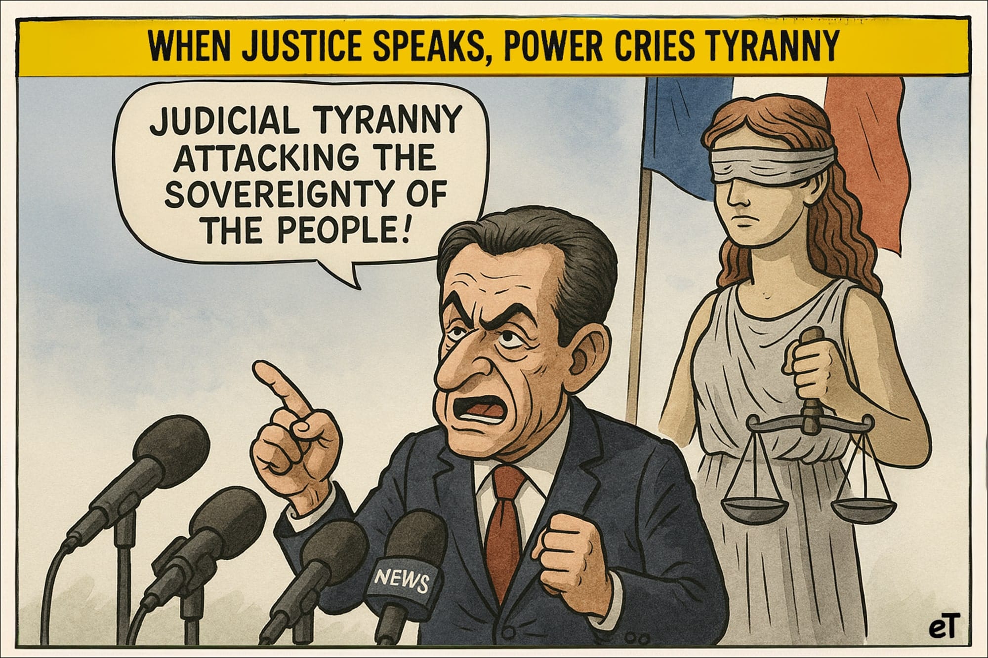 Nicolas Sarkozy sentenced to five years for illegal Libyan funding as allies decry “judicial tyranny,” yet citizens dismiss their defence, seeing long-untouchable elites finally held accountable. | Today’s Political Cartoon.