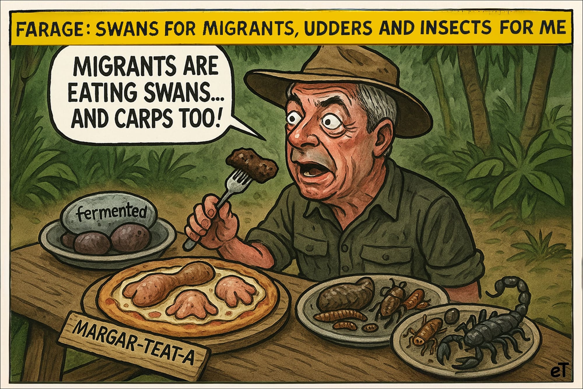 The laughable fake claim of Farage comes despite his own stint on ITV’s I’m a Celebrity, in 2023, where he consumed cow’s teats, camel udders, insects, and fermented delicacies in the jungle.