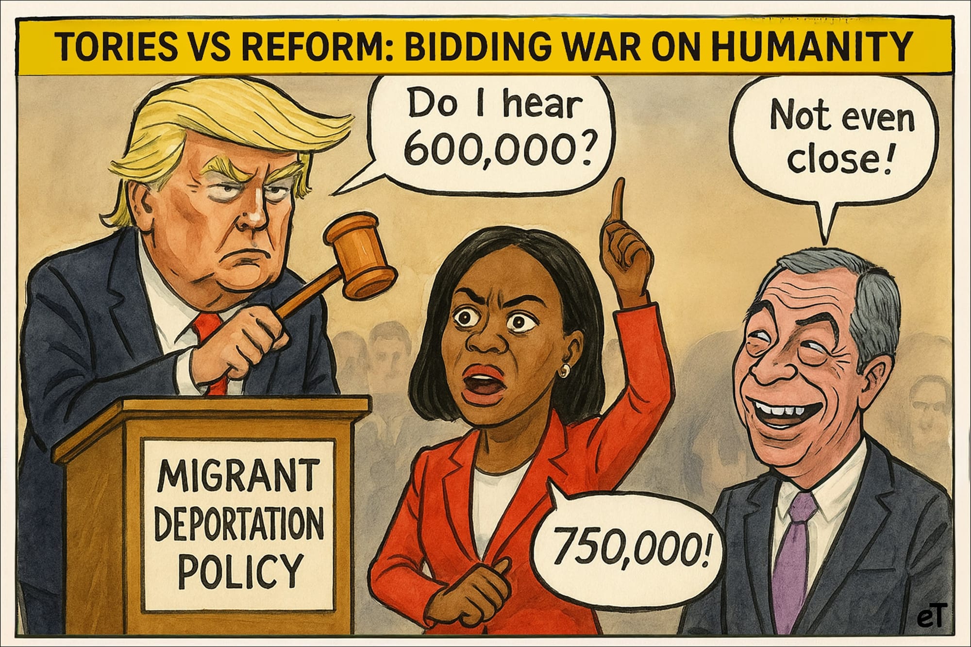 Kemi Badenoch vowed to deport 750,000 illegal migrants in five years, leave the ECHR, and scrap asylum appeals, appearing to try to outbid Nigel Farage’s populist deportation provocations. | Today’s Political Cartoon.