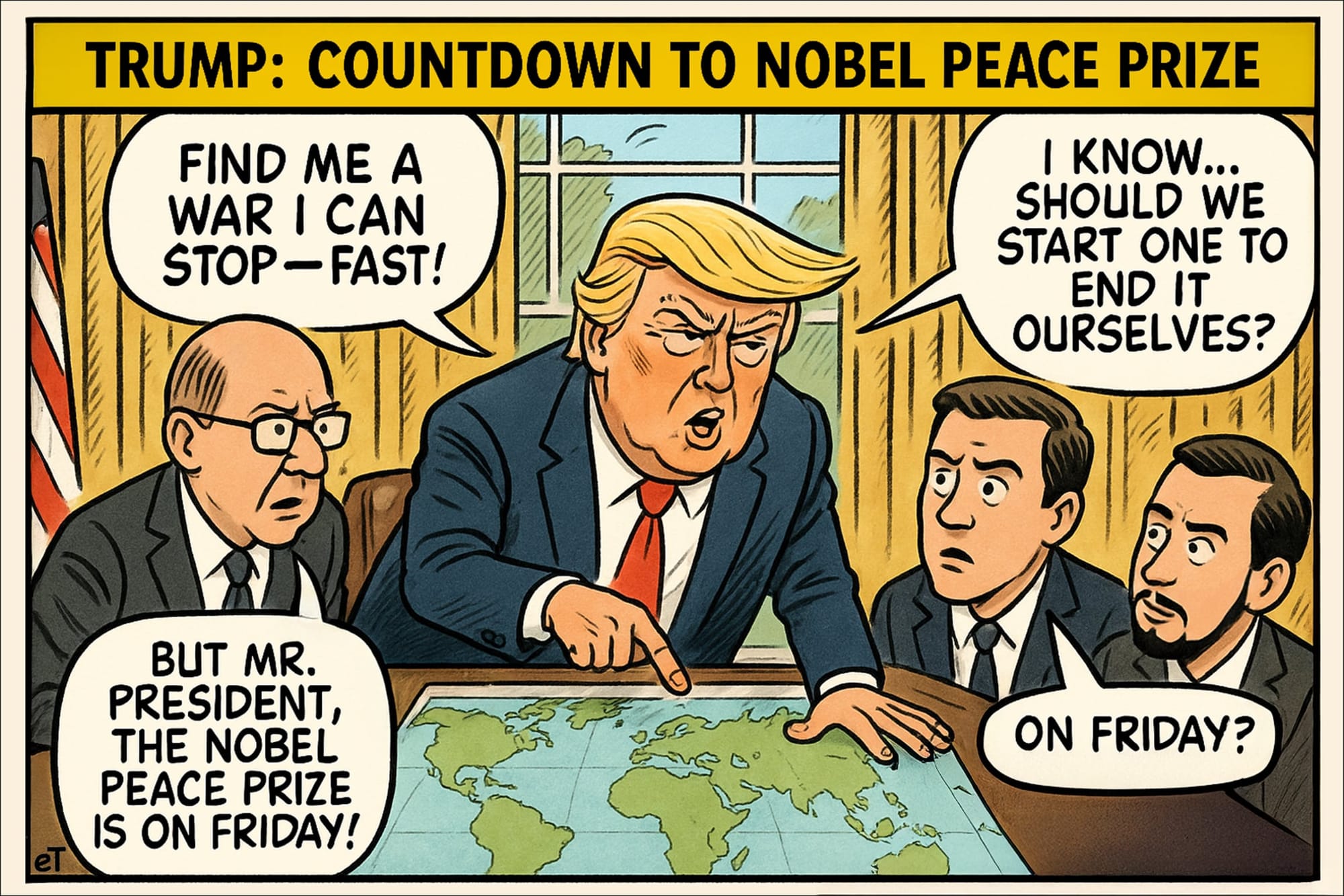 Donald Trump hastily brokers a Gaza ceasefire, touting himself as global peacemaker ahead of the Nobel announcement, but doubts grow over timing, motives, and his long-standing prize obsession. | Today’s Political Cartoon.