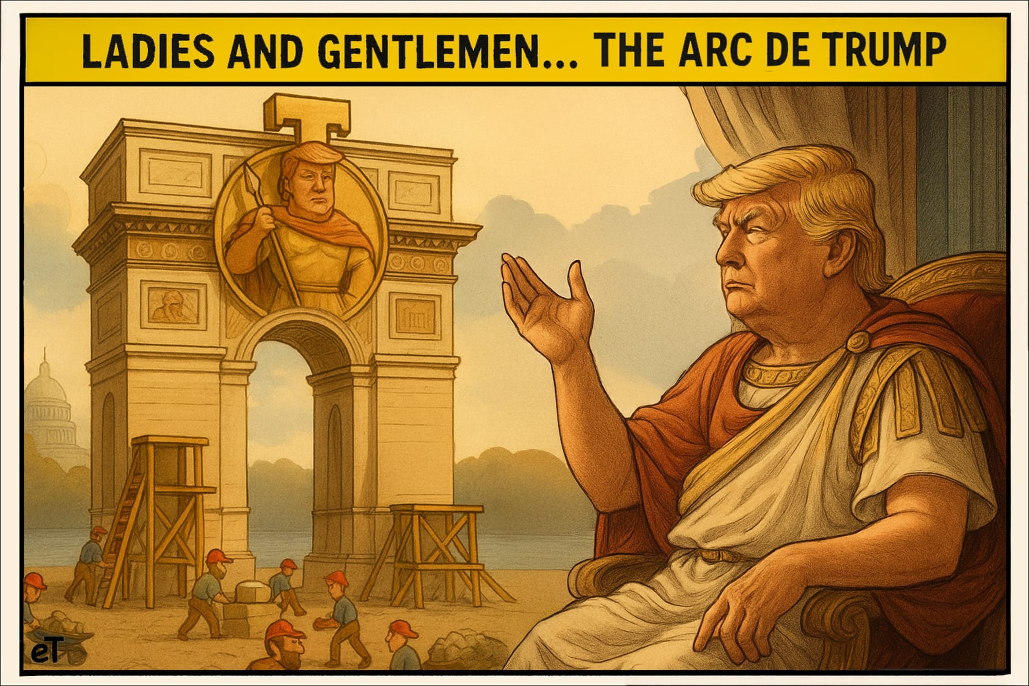 Donald Trump has unveiled plans for a monumental Arc de Triomphe for Washington D.C., showcasing his authoritarian vanity and self-glorification, while clashing with the democratic ideals America will celebrate on its 250th anniversary in 2026. | Today’s Political Cartoon.