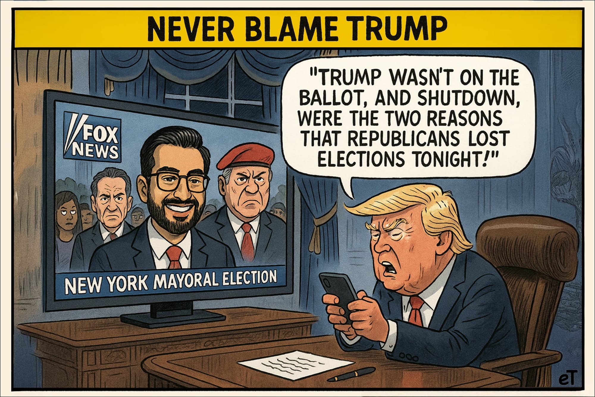 As Democrats celebrate sweeping U.S. victories, a furious Donald Trump lashes out online after major Republican losses, blaming everyone but himself. | Today’s Political Cartoon.