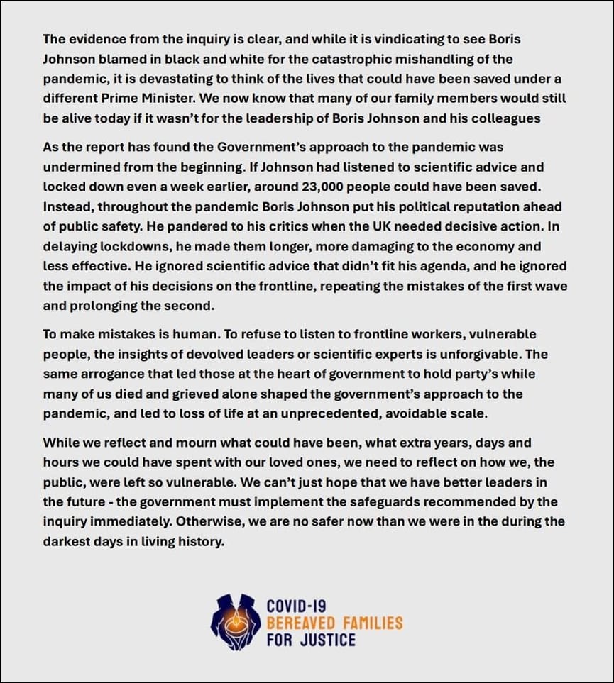 On BlueSky, COVID-19 Bereaved Families For Justice UK are now actively calling for action on Boris Johnson, saying that “Boris Johnson’s silence is deafening, and his contempt for the bereaved is clear. His actions during the pandemic amount to one of the gravest betrayals of the British public in history. His decisions cost tens of thousands of lives that could and should have been saved.