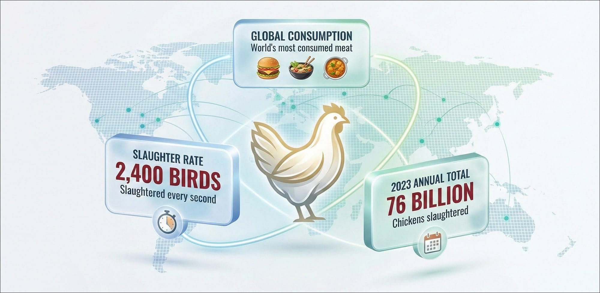 W hen you next bite into a chicken sandwich, consider this: 2,400 of these birds are being slaughtered somewhere in the world every second. From street stalls in Mumbai to supermarkets in Beijing, chicken has become the world’s most consumed meat. In 2023 alone, humans slaughtered an astonishing 76 billion chickens.